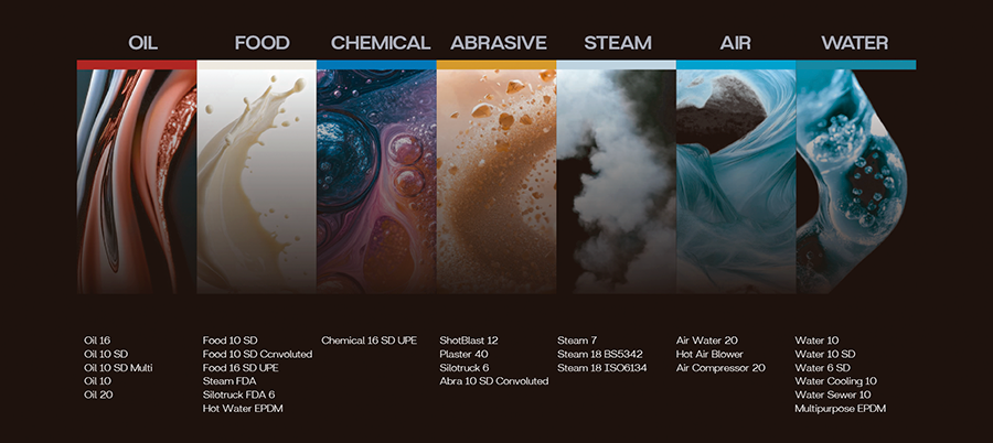 Destacan por su calidad y versatilidad, lo que garantiza su máximo rendimiento incluso en condiciones de trabajo muy exigentes. Especialmente fabricadas para el transporte seguro de fluidos y materiales como agua, aire, vapor, productos químicos, combustibles, alimentos, bebidas y materiales abrasivos.